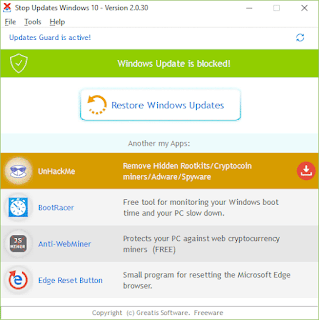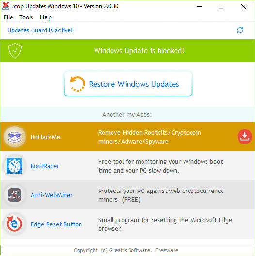 Estamos felizes em informar que parou as atualizações. Esperamos 30 minutos para ter certeza. O StopUpdates10 requer instalação, mas é simples de usar. Por padrão, você deve ver «As atualizações do Windows não estão bloqueadas» em letras vermelhas e um botão vermelho que diz “Pare as atualizações do Windows!”. Uma vez bloqueado, tudo é invertido e em letras verdes com texto que diz “Windows Atualizado está bloqueado!”, e um botão que diz “Restaurar atualizações do Windows”. Além disso, a Greatis oferece links para seus outros programas de freeware, incluindo UnHackMe, BootReacer, Anti-WebMiner e Edge Reset Button.